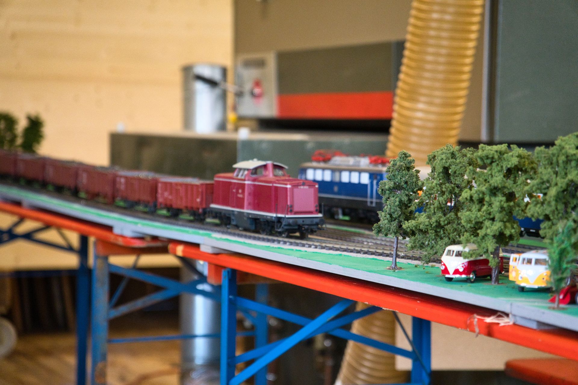 Schließlich beeindruckte die 25 Meter lange Spur H0e-Modul-Anlage von Matthias Hell, auf der er markante Teile der Pinzgauer Lokalbahn mit mehreren Stationen darstellte. Auch diese Module entstanden in Eigenbau. Bei Aufbau und Betrieb wurde er von Johannes Gleis, Alex Blenk, Niklas Gürntke und Andi Mayer unterstützt.