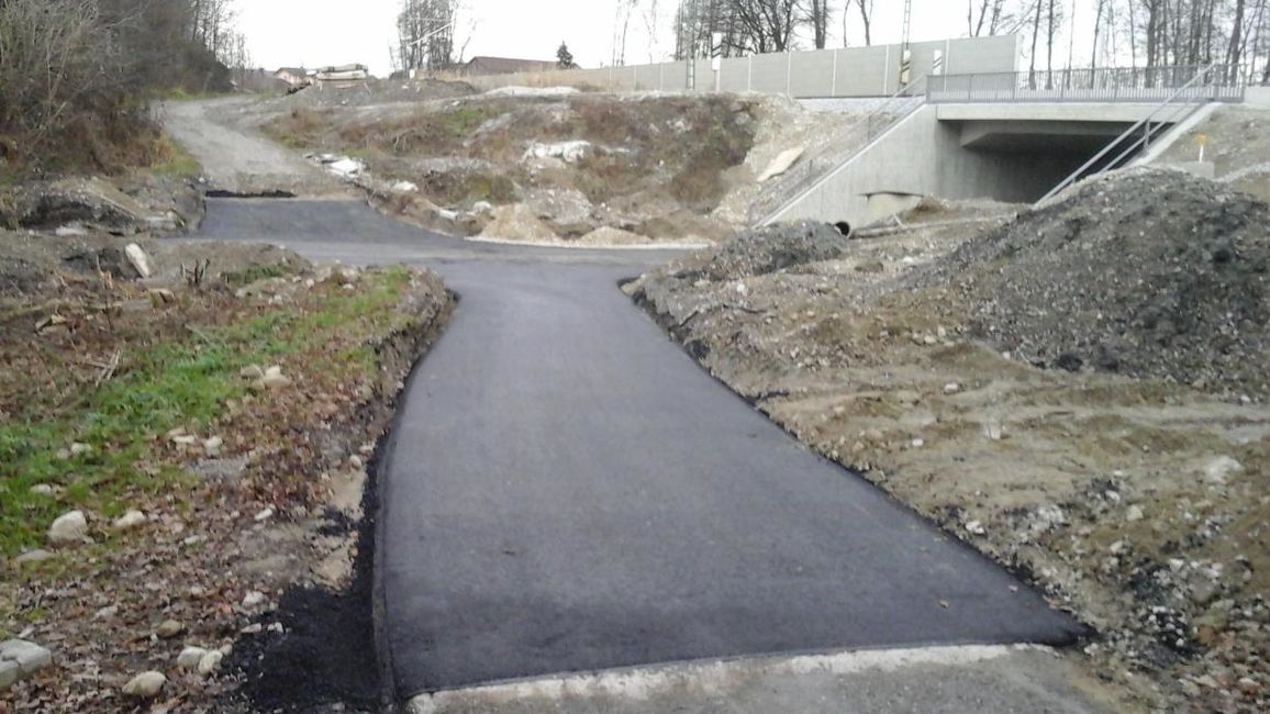 Die letzten sieben Bilder in diesem Reigen zeigen Aufnahmen vom 19. Dezember 2015 gegen 12.45 Uhr. Die provisorische Abkürzung Richtung Egarten war gleich wieder Geschichte (ein Provisorium, das wirklich mal seinem Namen Ehre gab). Jetzt kann sich die Natur den nicht versiegelten Raum zurückholen und wann es mit der Tieferlegung der Straße unter der Brücke und dem Ausbau der Schlößlstraße bis Westerndorf weitergeht, kann jetzt im Januar 2016 noch nicht vorhergesagt werden.
