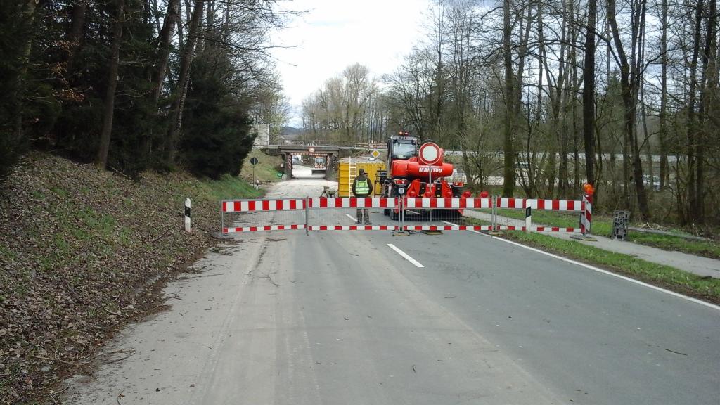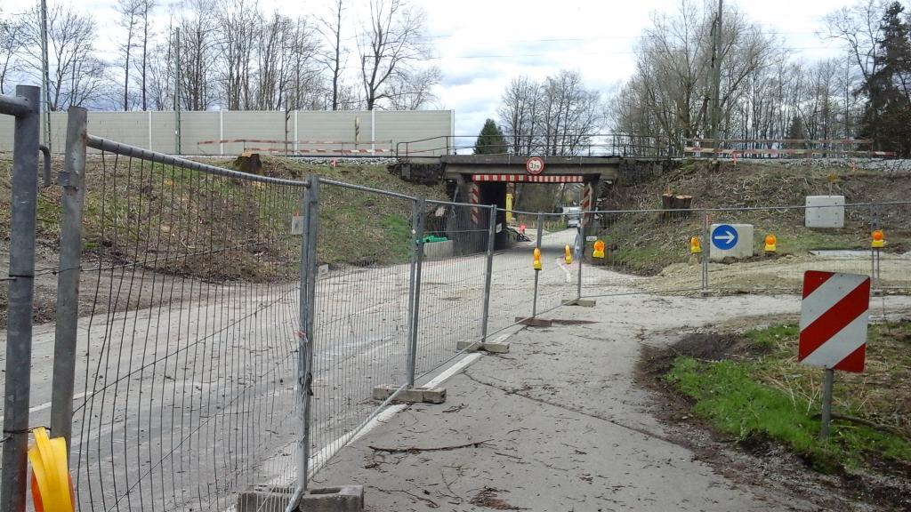 Die ersten drei Fotos zeigen den Zustand vor dem Abriß der alten Unterführung. Aufnahmen vom Nachmittag des 31. März 2015, ca. 16.30 Uhr. Zu den ersten Arbeiten der Bahn gehörte die Abtragung der alten Unterführung, damit für jedes Richtungsgleis der zweigleisigen Hauptbahn München - Rosenheim eine Hilfsbrücke eingeschoben werden konnte. Die neue Unterführung entstand dann im Laufe des Jahres bei laufenden Bahnbetrieb und gesperrter Straße genau unter den Hilfsbrücken. Im Gegensatz zu anderen Brückenbaustellen, wo eine neue Brücke (oder Unterführung) neben der alten errichtet und dann eingeschoben wird, wurde hier aus Platzgründen der Bau darunter erwogen und die Brücke dann abschließend auf Höhe gebracht.