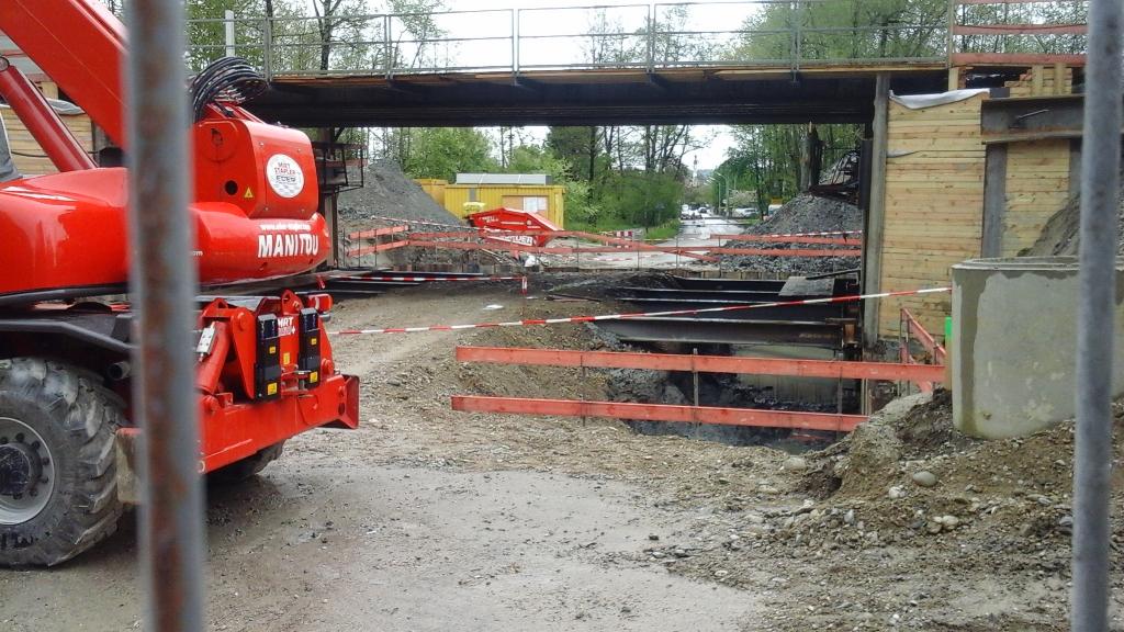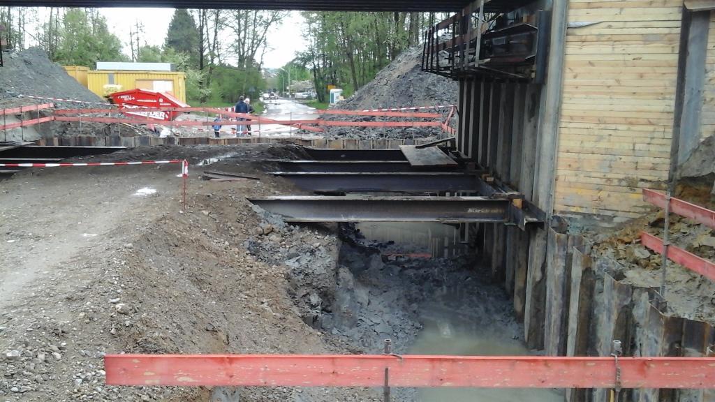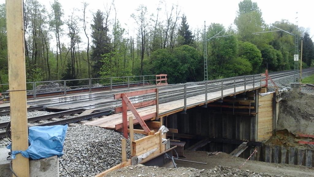 Die nächsten sechs Bilder zeigen den Zustand vom Nachmittag, 2. Mai 2015, ca. 15.45 Uhr. Die seitlichen Spundwände schützen den Bahndamm vor dem Abrutschen. Die Hilfsbrücke erscheint in seiner Stärke recht filigran, erlaubt aber beim Darüberfahren eine zugelassene Geschwindigkeit für Eisenbahnfahrzeuge von 90 km/h. Die Gründung im Boden musste sehr tief ausfallen, da durch den Rosenheimer Seeton der Untergrund auch hier instabil ist. Mehrmals musste am Anfang der Brückenarbeiten am Bahndamm Schotter nachgefüllt werden, weil der vorhandene Schotter teilweise im Nirwana des Bodens verschwand. Die Bahnunterführung wurde aber nicht nur an den Spundwänden tief ausgehoben, sondern später auch auf ganzer Straßenbreite.