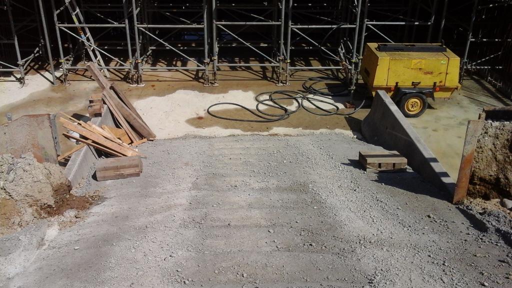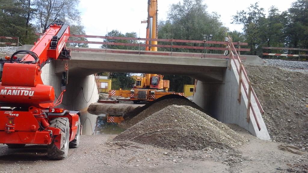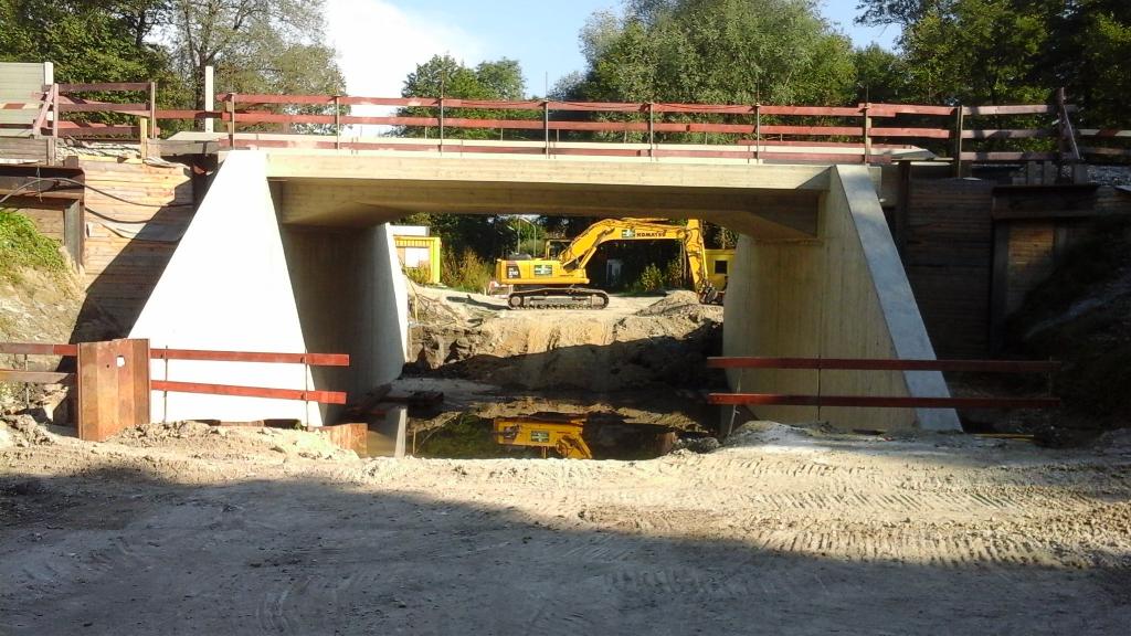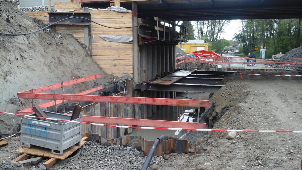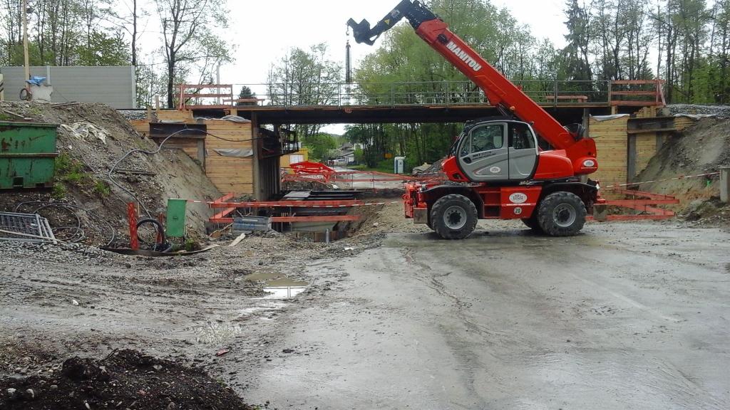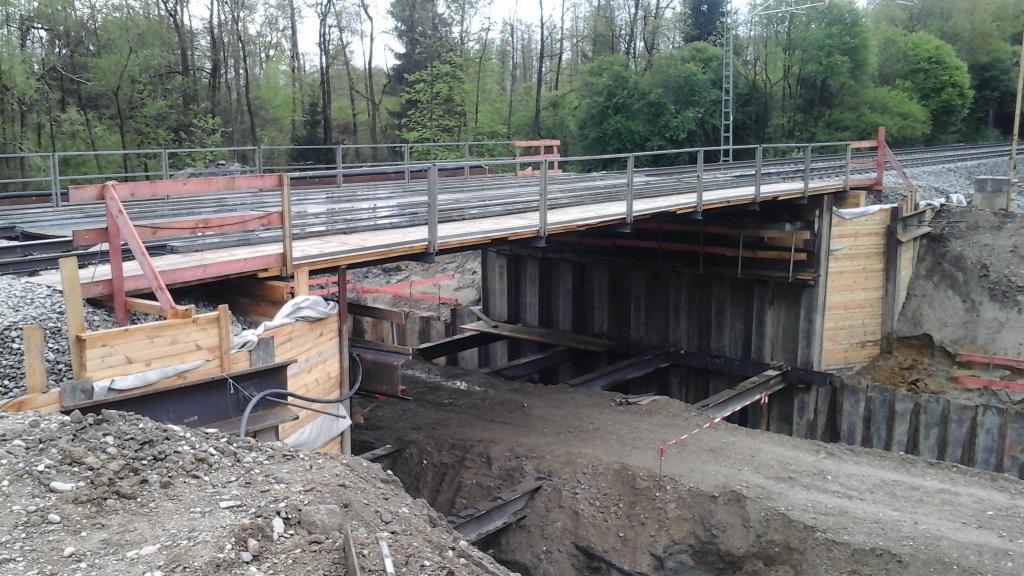 Beim Brückentausch wurde der Gleiskörper wieder geöffnet, die Hilfsbrücken herausgehoben und dann auf der neuen Brücke das Planum herausgearbeitet, so dass der neue Bahnkörper nun auf der neuen Brücke liegt.