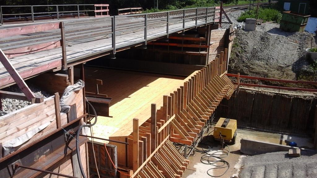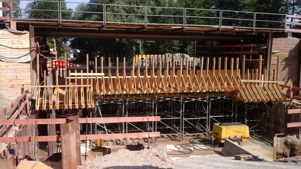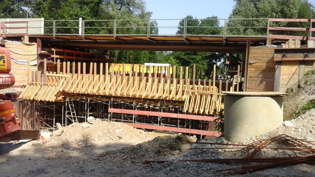 Die nächsten fünf Fotos stammen vom 4. Juli 2015, ca. 16.00 Uhr. An der Holzverschalung erkennt man schon die Form der neuen Brücke. Wie oben erwähnt wurde, wird die Brücke an Ort und Stelle neu errichtet und dann noch oben gehievt.