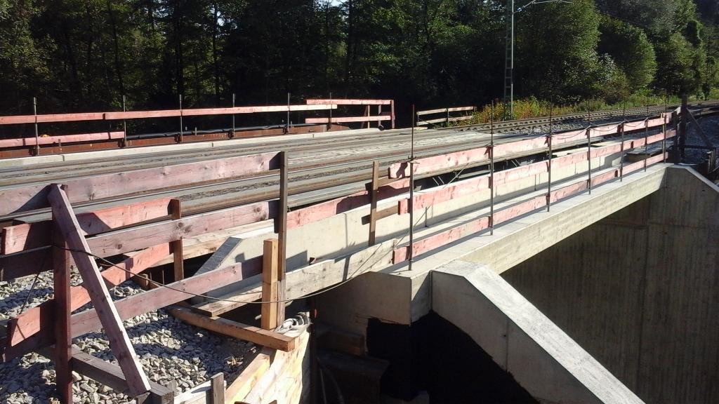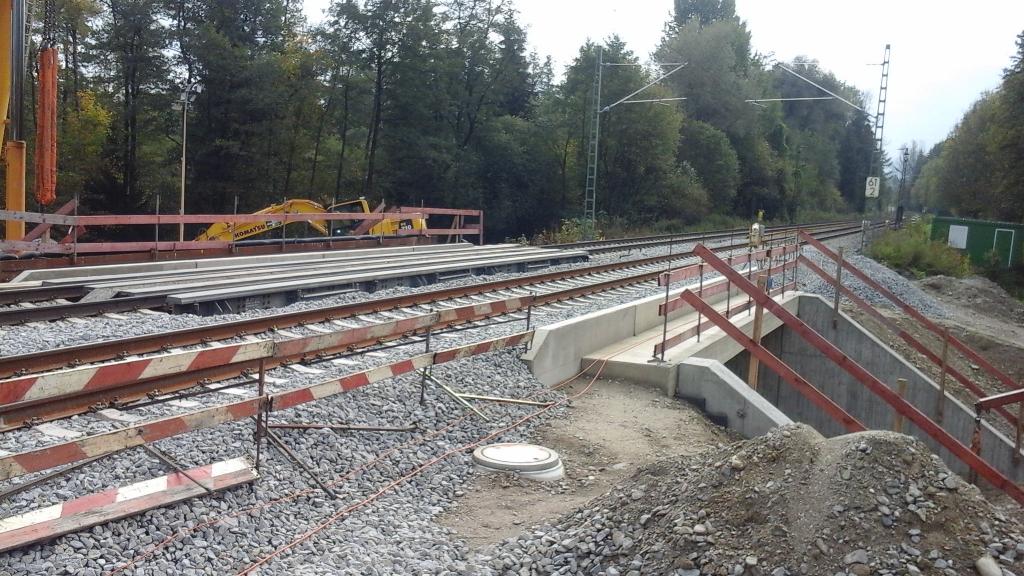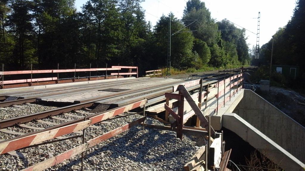 Auf den folgenden Bildern ist zu sehen, wie die neue Brücke bereits in die Endlage gebracht ist. Auf dem einen Bild vom 17.09.2015, 16.15 Uhr sind noch die Hilfsstützen zu sehen. Die weiteren fünf Fotos stammen vom 3. Oktober, ca. 16.30 Uhr und zeigen eine im Rohzustand schon fertige Bahnunterführung. Auf der neuen Brücke befinden sich aber immer noch freitragend die Hilfsbrücken. Diese wurden erst jeweils Samstagabend bis Montagmorgen 10. - 12. (Regelgleis Richtung Süden) und 17. - 19. Oktober (Regelgleis Richtung Norden) wieder ausgebaut. Vom ersten Wochenende zeigen am Regelgleis Großkarolinenfeld - Rosenheim eine Woche später die beiden Bilder vom 17. Oktober ca. 13.30 Uhr. Die auf dem Foto noch sichtbare linke Hilfsbrücke (Regelgleis Rosenheim - Großkarolinenfeld) wurde dann an diesem Abend ausgebaut.