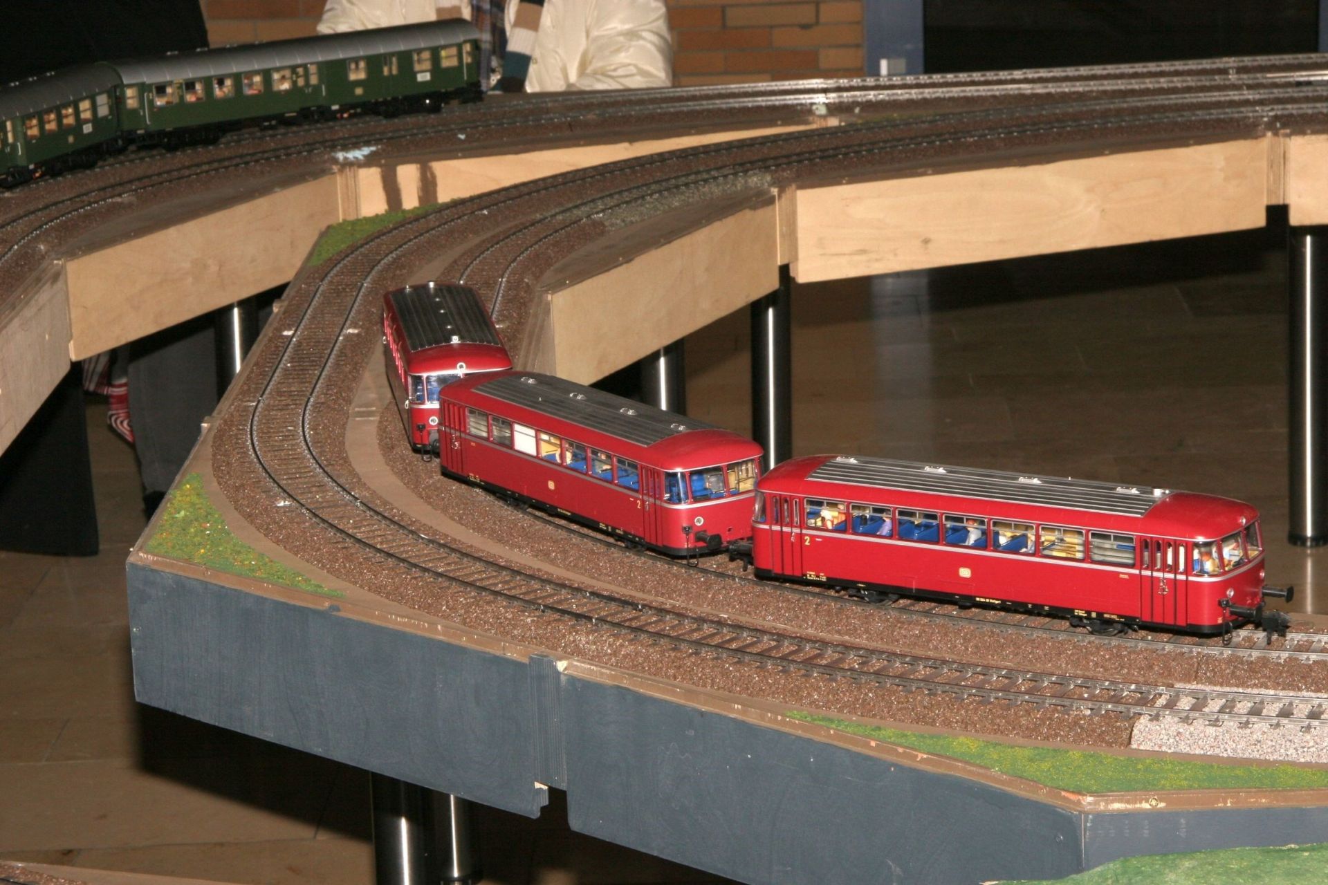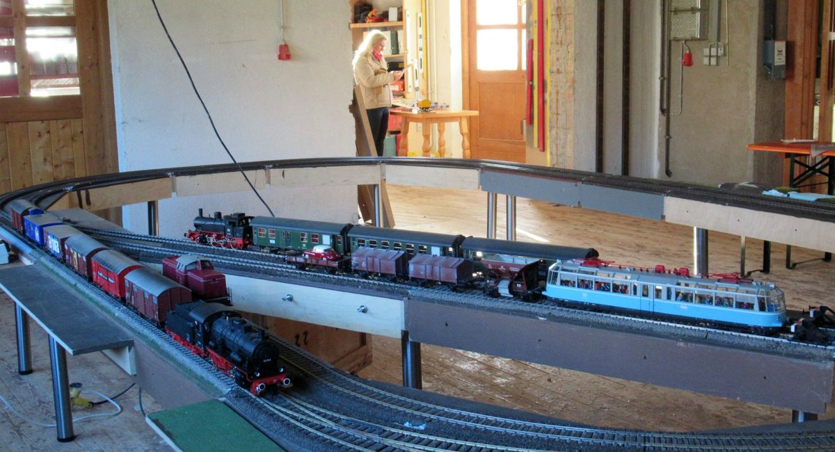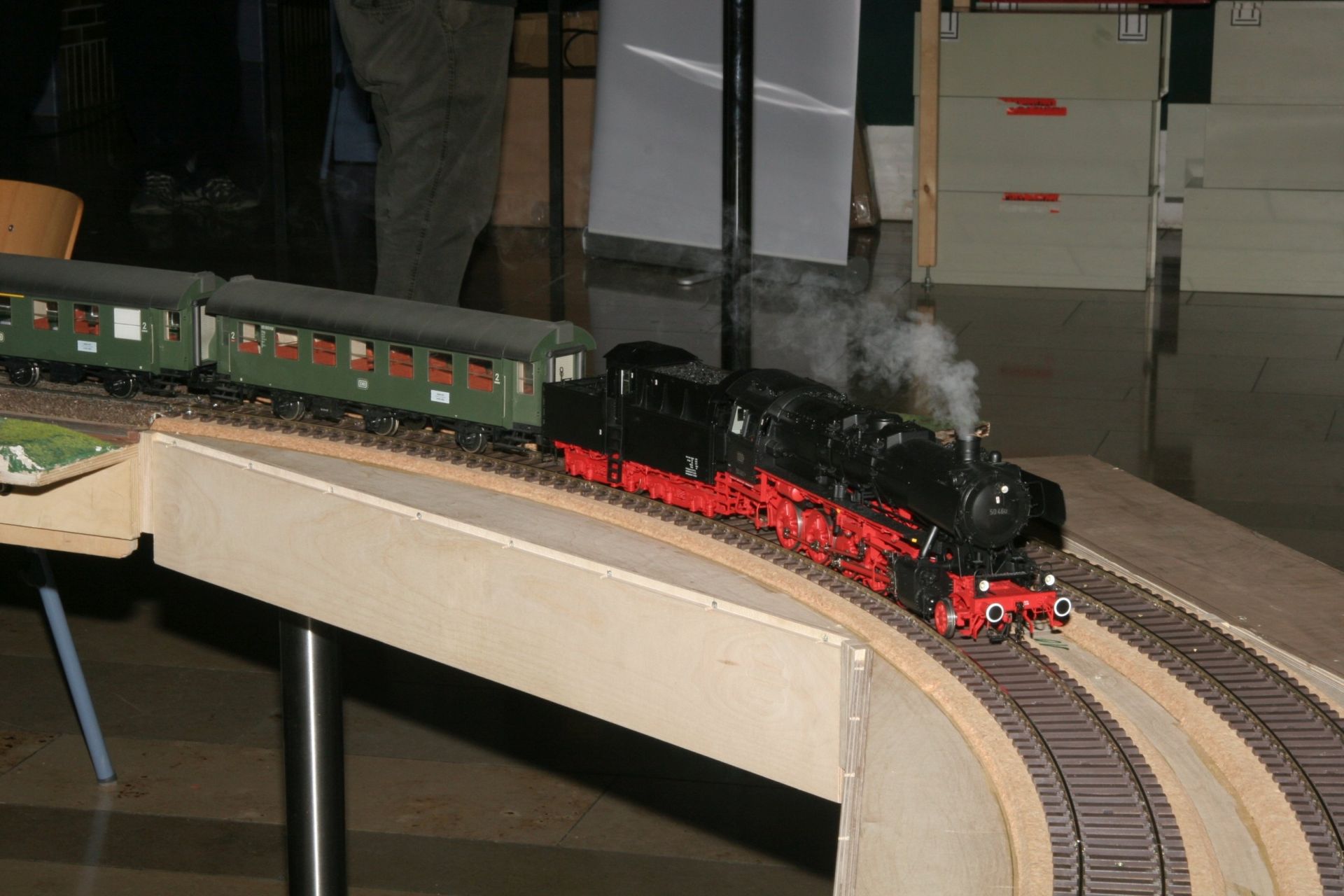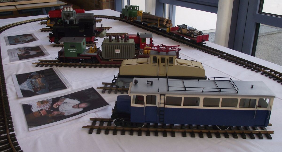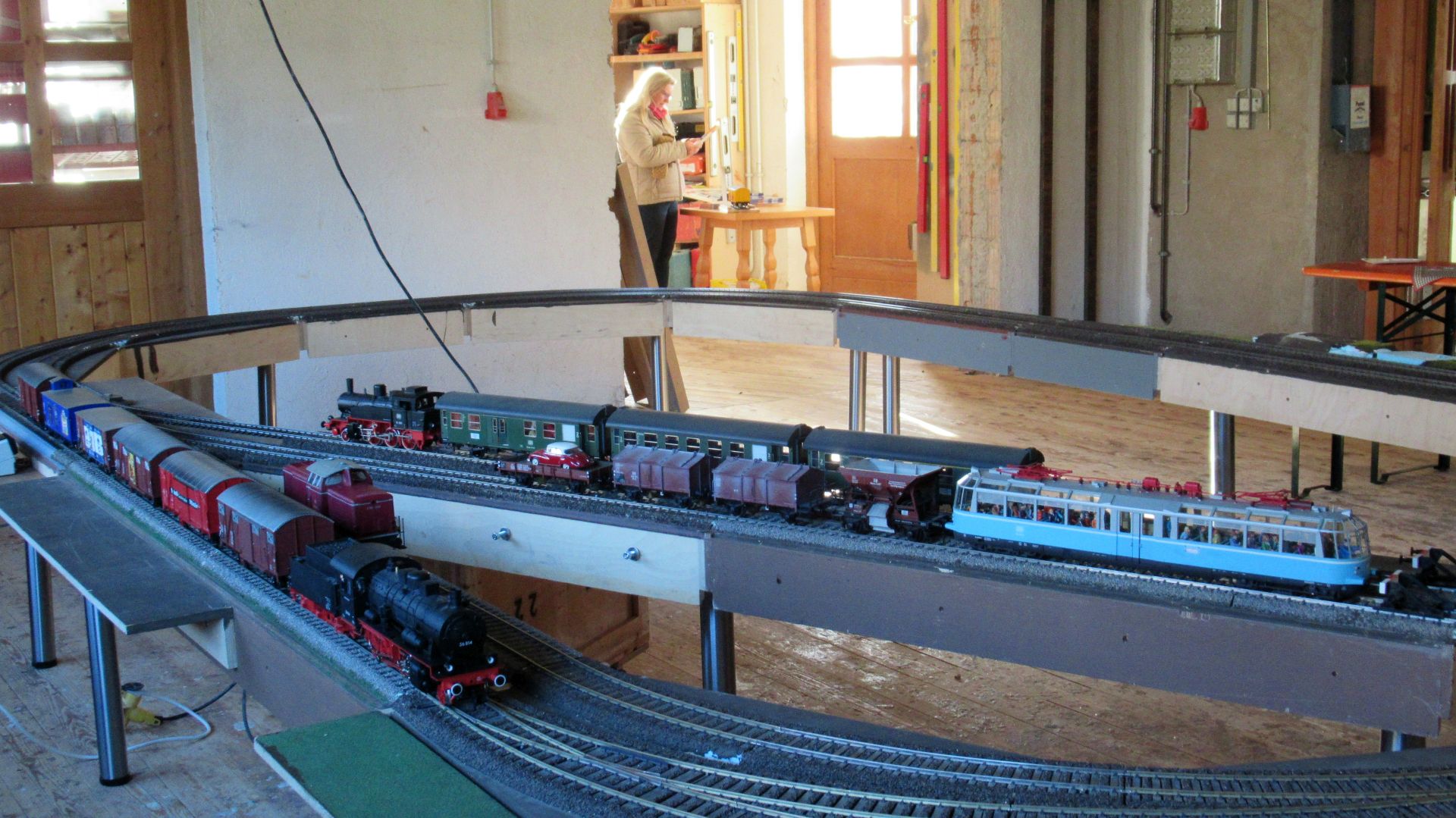 Auf Einladung unseres Mitglieds Peter Moser, der uns in seiner Schreinerwerkstatt in Nußdorf Räume zur Verfügung gestellt hat, konnten wir nicht nur in einer Halle unsere große Anlage aufbauen, sondern in einem zweiten Raum noch eine kleinere Anlage Kindern zum Spielen zur Verfügung stellen. Mit einer beachtlichen Anzahl von Fahrzeugen wurde dem zahlreichen Publikum an vier Tagen ein reger Fahrbetrieb vorgestellt. Die Fahrzeuge in dem großen Maßstab 1:32 beeindruckten durch ihre Detailgenauigkeit und die vielen Funktionen, wie zum Beispiel Fahr- und Signalgeräusche oder das "Rauchen" der Dampfloks.