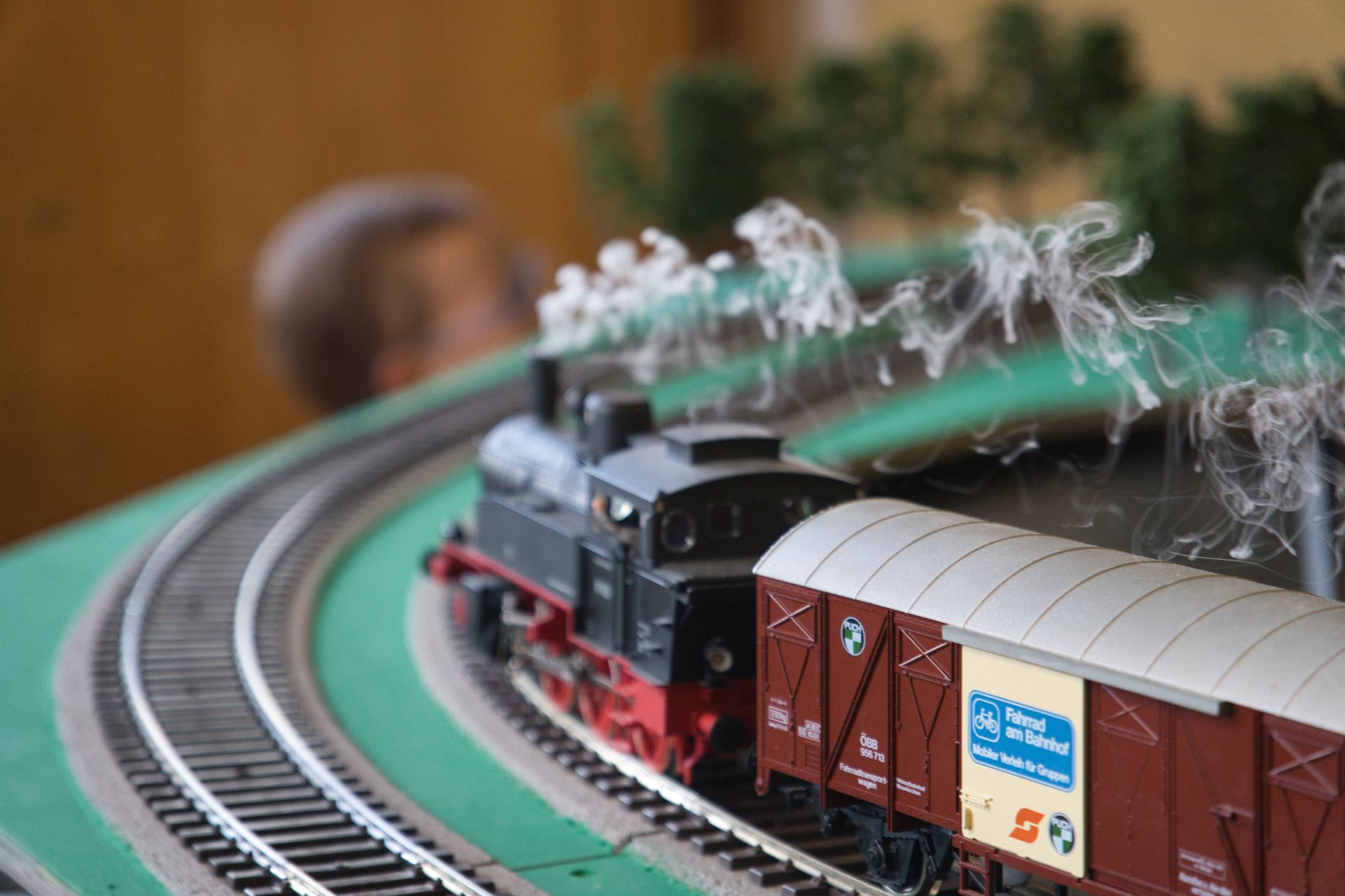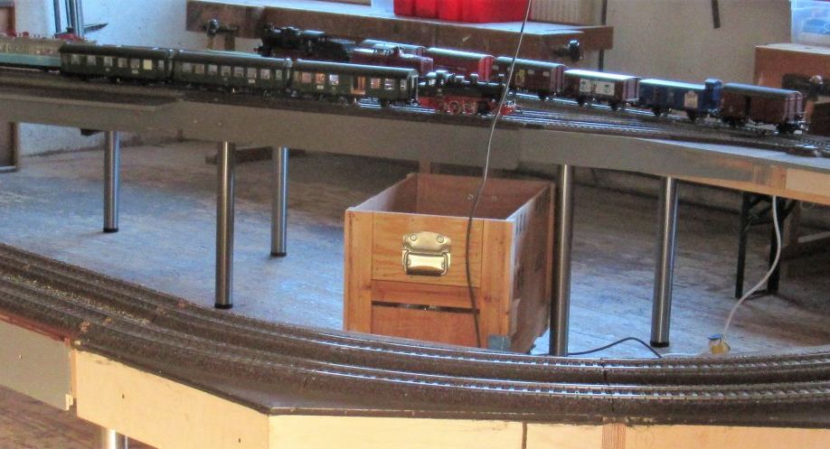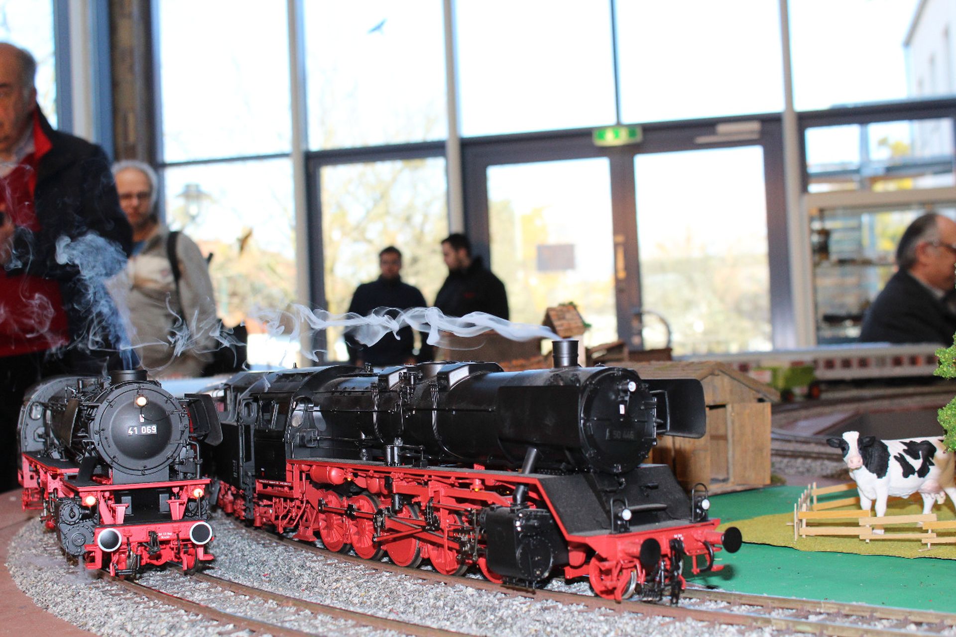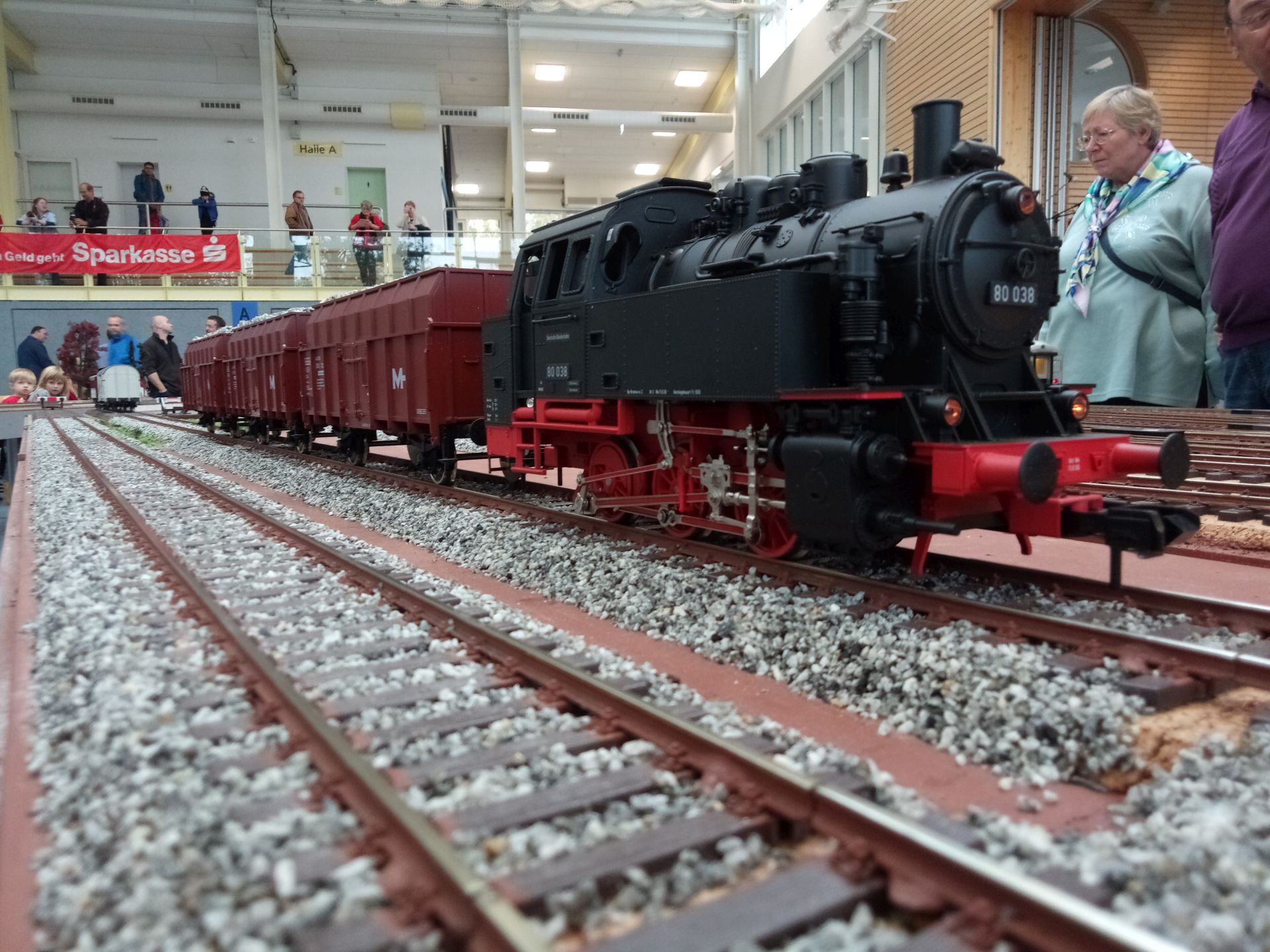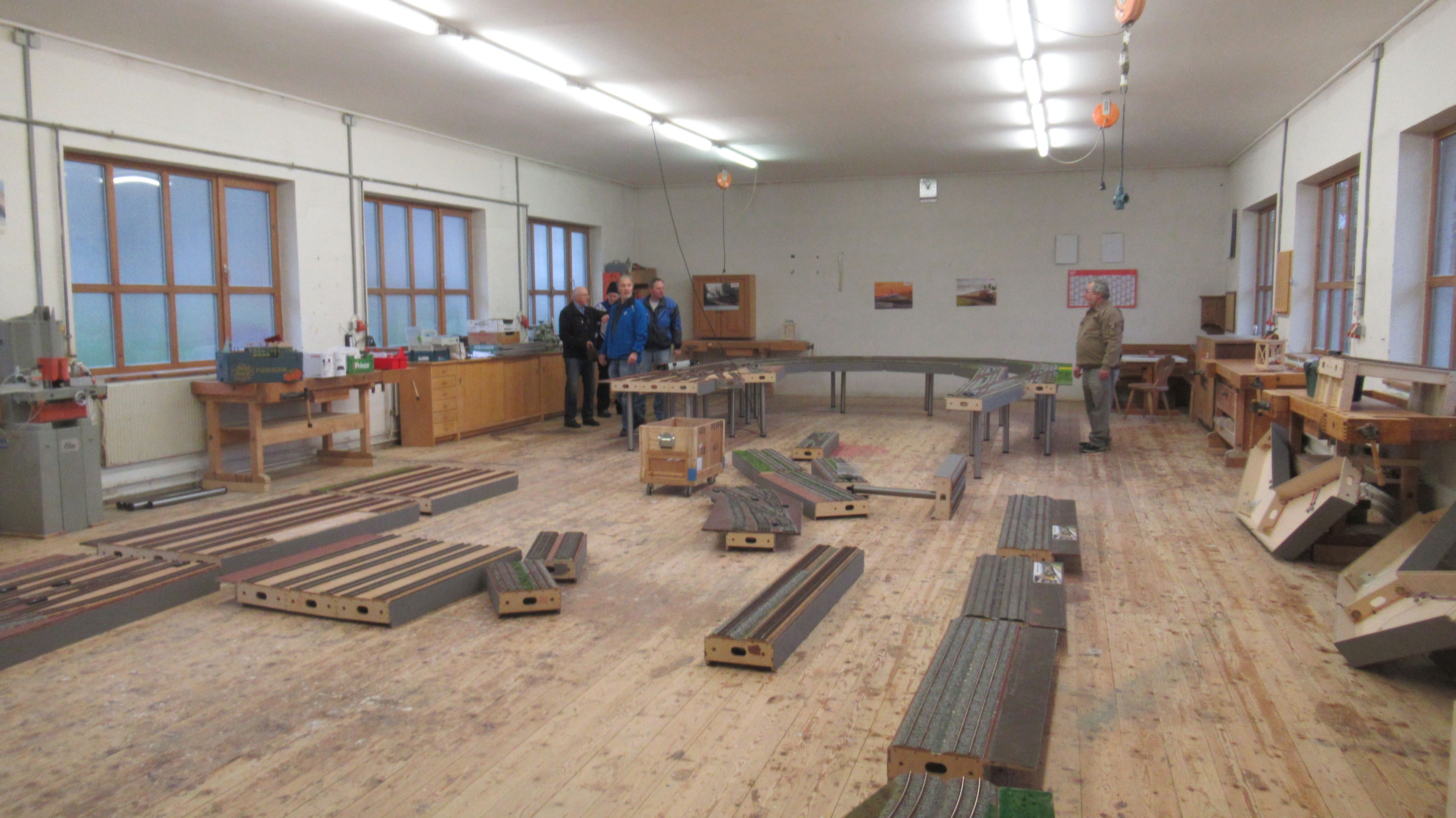 Auf Einladung unseres Mitglieds Peter Moser, der uns in seiner Schreinerwerkstatt in Nußdorf Räume zur Verfügung gestellt hat, konnten wir nicht nur in einer Halle unsere große Anlage aufbauen, sondern in einem zweiten Raum noch eine kleinere Anlage Kindern zum Spielen zur Verfügung stellen. Mit einer beachtlichen Anzahl von Fahrzeugen wurde dem zahlreichen Publikum an vier Tagen ein reger Fahrbetrieb vorgestellt. Die Fahrzeuge in dem großen Maßstab 1:32 beeindruckten durch ihre Detailgenauigkeit und die vielen Funktionen, wie zum Beispiel Fahr- und Signalgeräusche oder das "Rauchen" der Dampfloks.