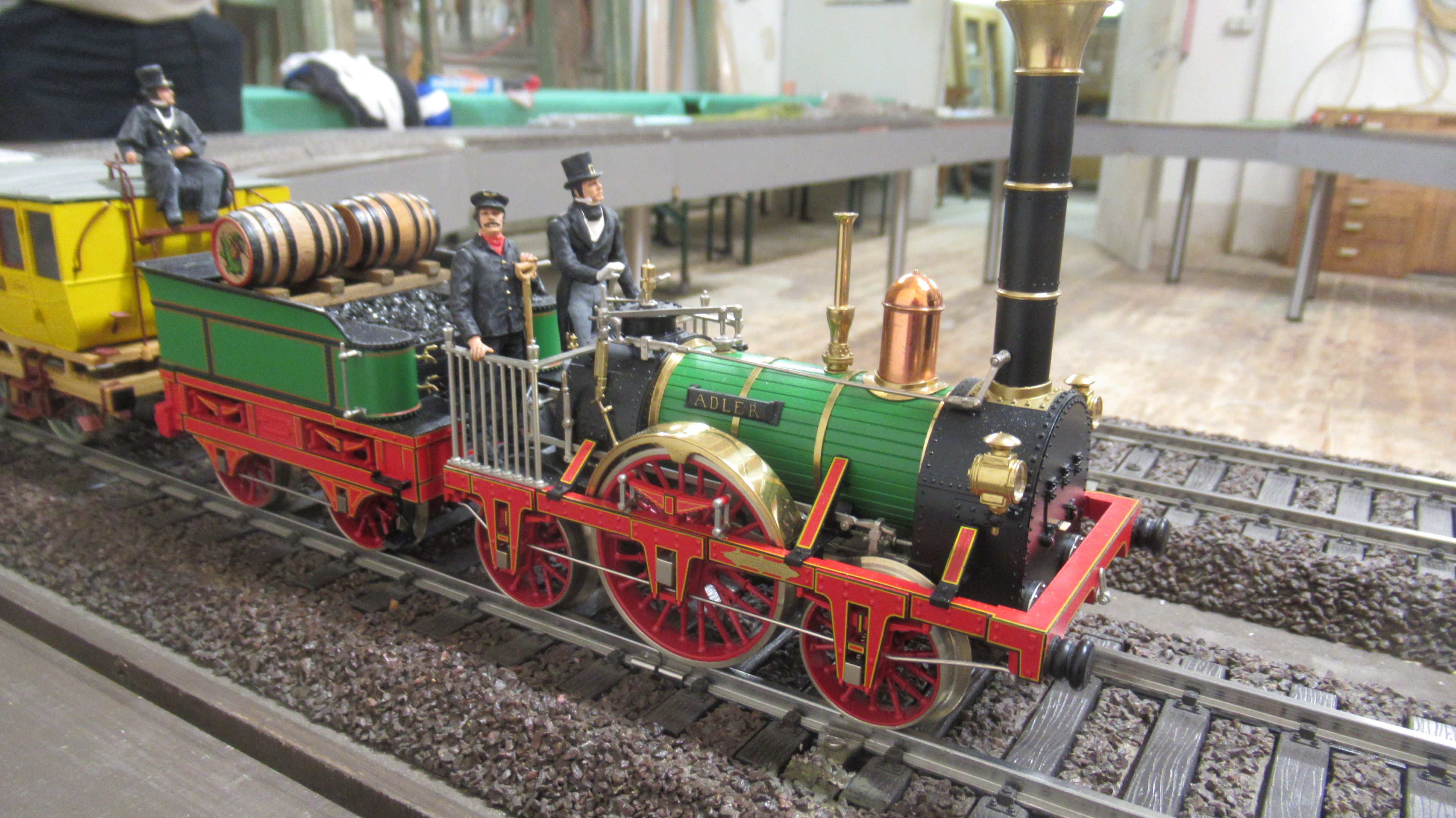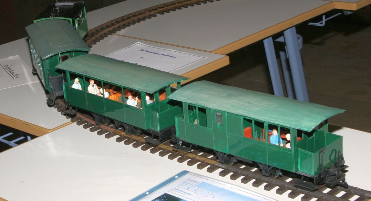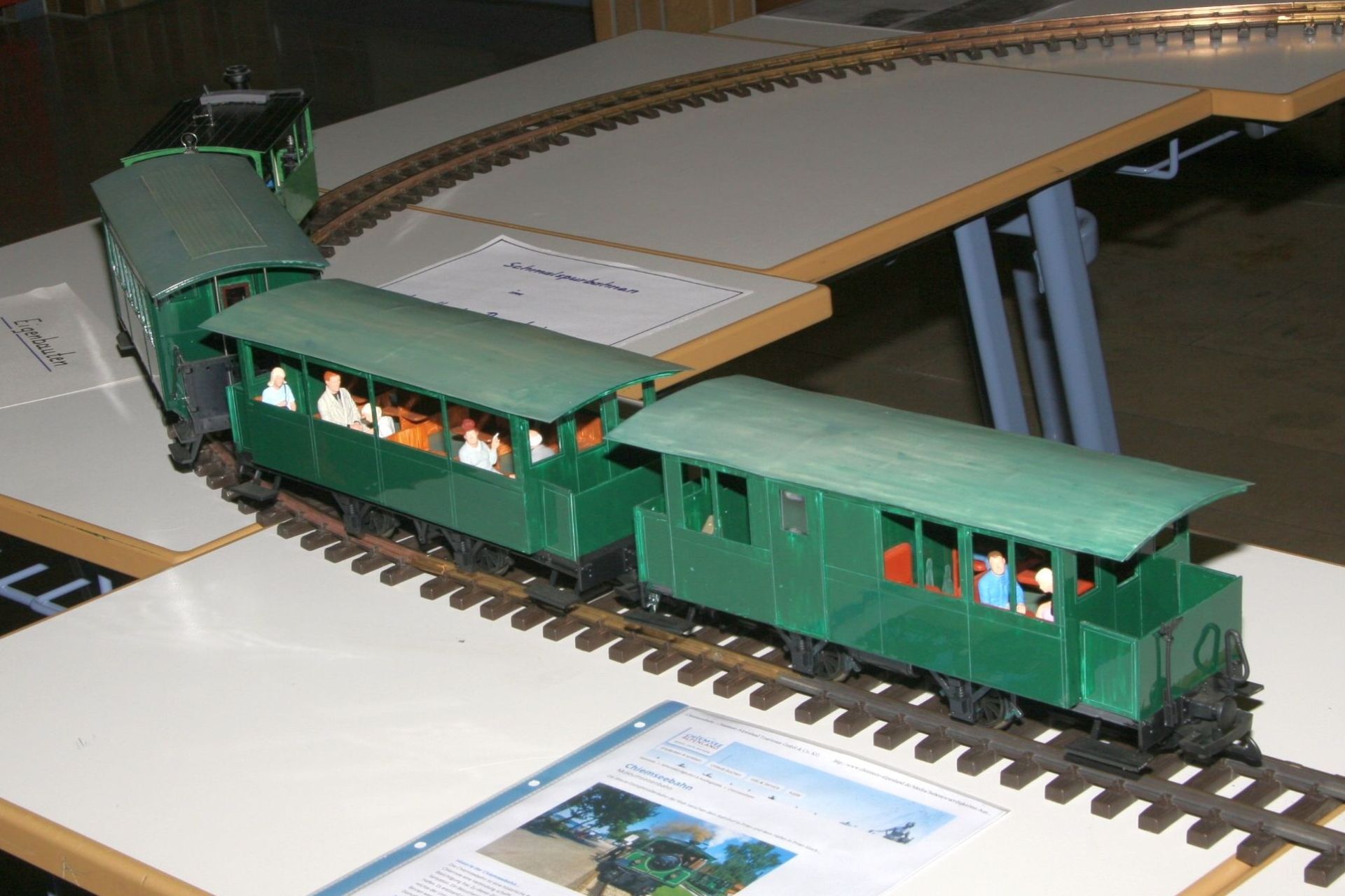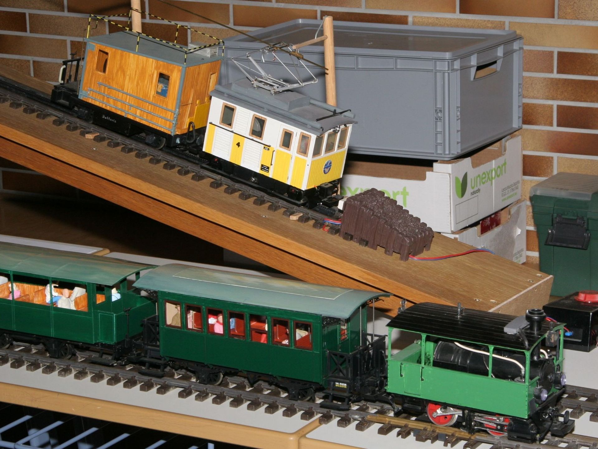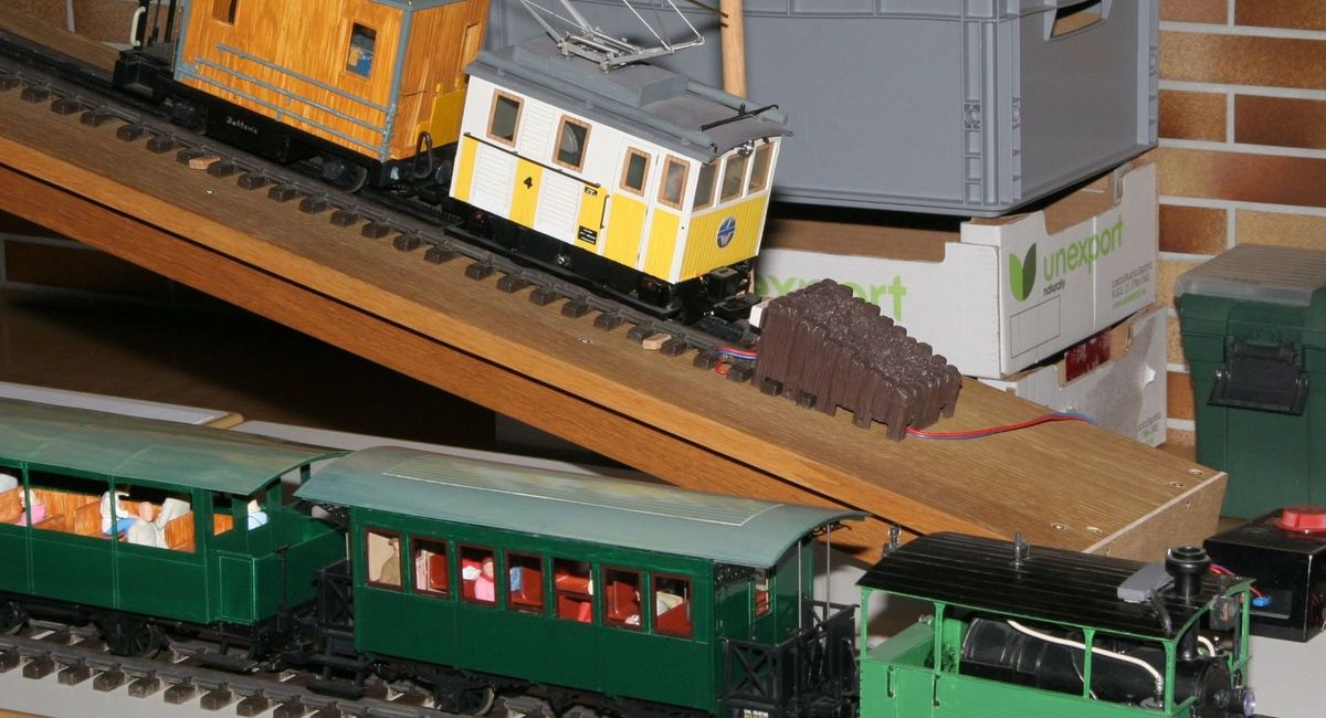 Wie im Vorjahr ging es dann im ersten Stock weiter. Leonhard Schmelzer hatte wieder eine schöne Spur-0-Anlage mit den selbstgefertigten Modulen aufgebaut und Willi Hell präsentierte seine perfekten Eigenbauten in Spur 2m: Die alte Wendelstein-Zahnradbahn, das Chiemsee-Bockerl und das Wachtl-Krokodil. Alles Modelle von Schmalspurvorbildern aus dem Landkreis Rosenheim, die noch im Original zu sehen sind.