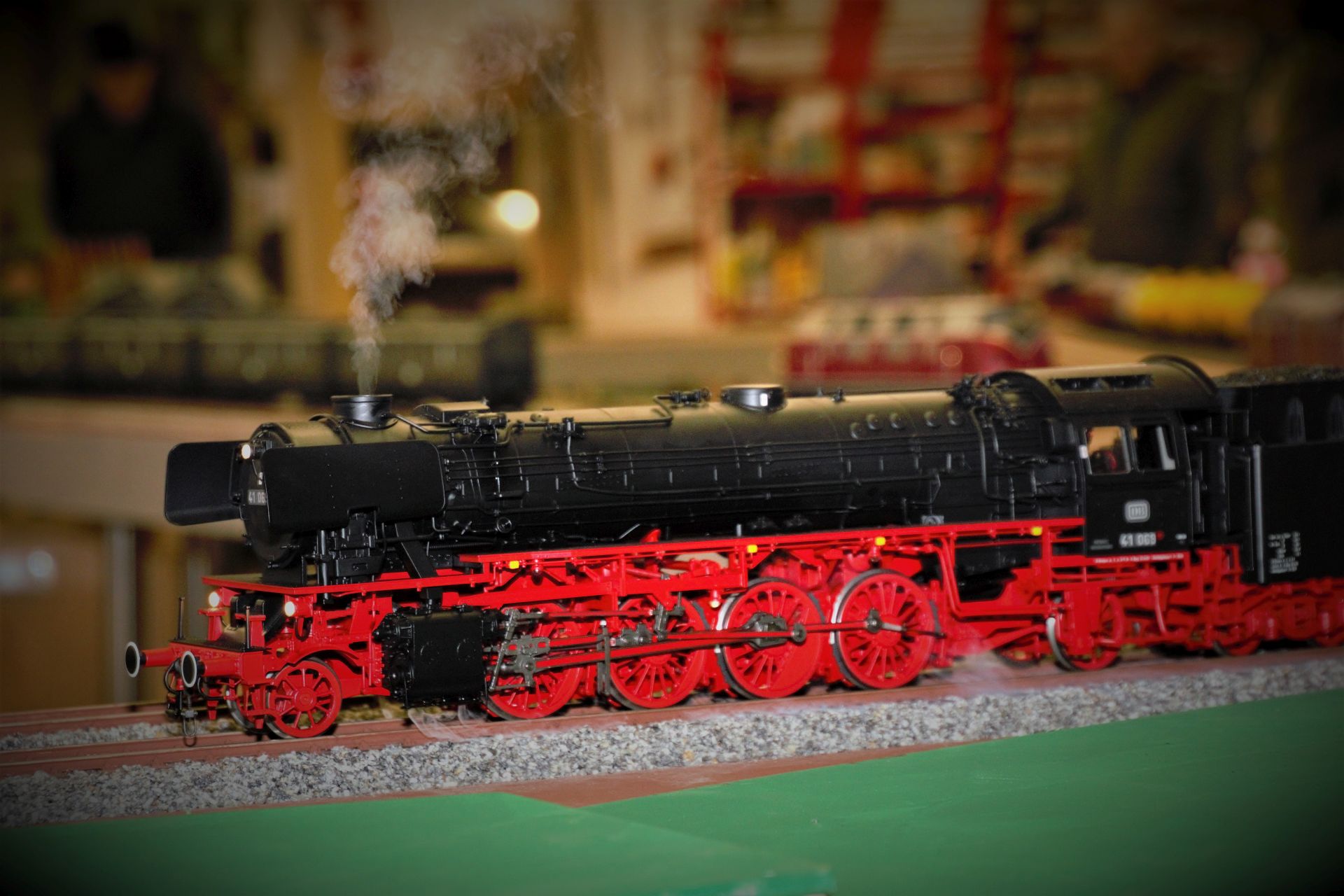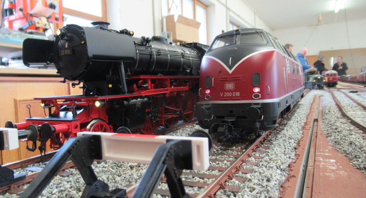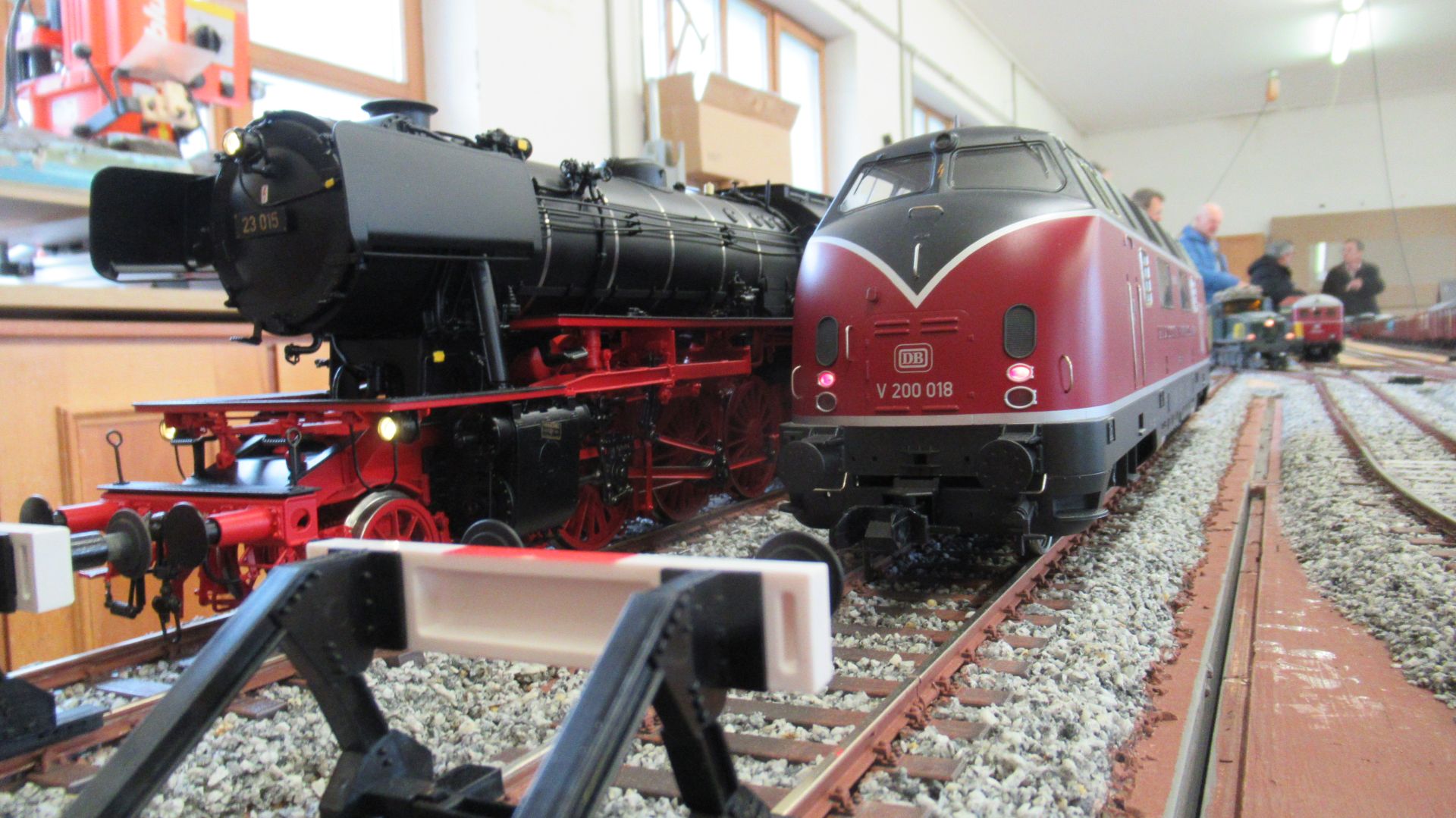 Noch raumfüllender als bisher und entsprechend dominant trumpfte die Spur-1-Modul-Anlage des Eisenbahnclubs Rosenheim auf. Der auf fünf Gleise erweiterte Bahnhof und die neuen Kurven mit den großen Radien nebst Bogenweichen waren dafür verantwortlich. Hier ist die Arbeit von Gerhard Glass hervorzuheben, der die neuen Module plante und anfertigte. Schorsch Höfer half beim Modulbau mit. Die vielen Lokomotiven – alle in Privatbesitz – glänzten mit einer Vielzahl an Funktionen, welche die Digital-Decoder hergaben. Verantwortlich für die Steuerung der Anlage und die Fahrzeuge sind Toni Lorenz und Rainer Wunderlich.