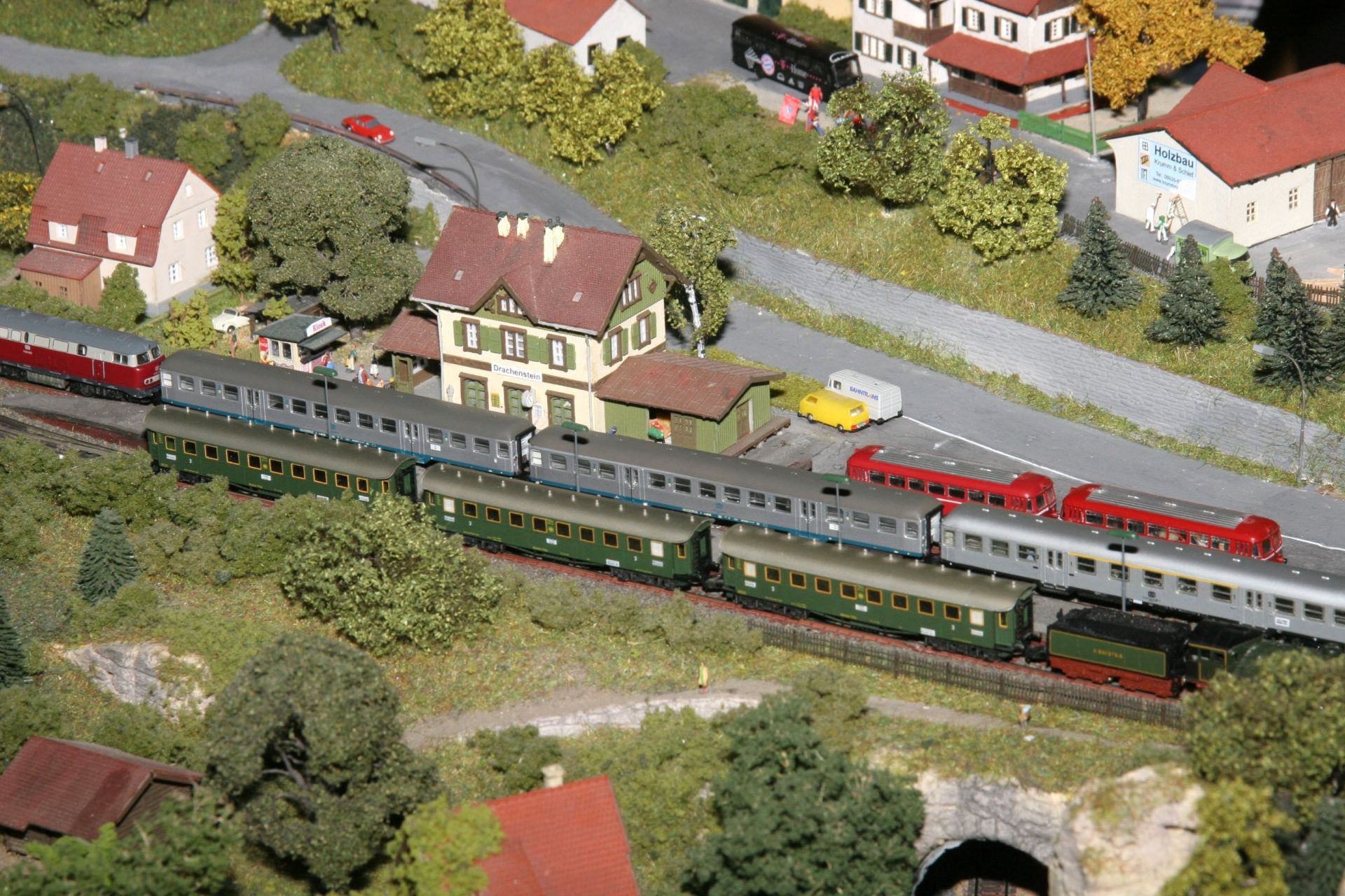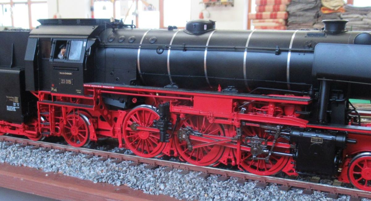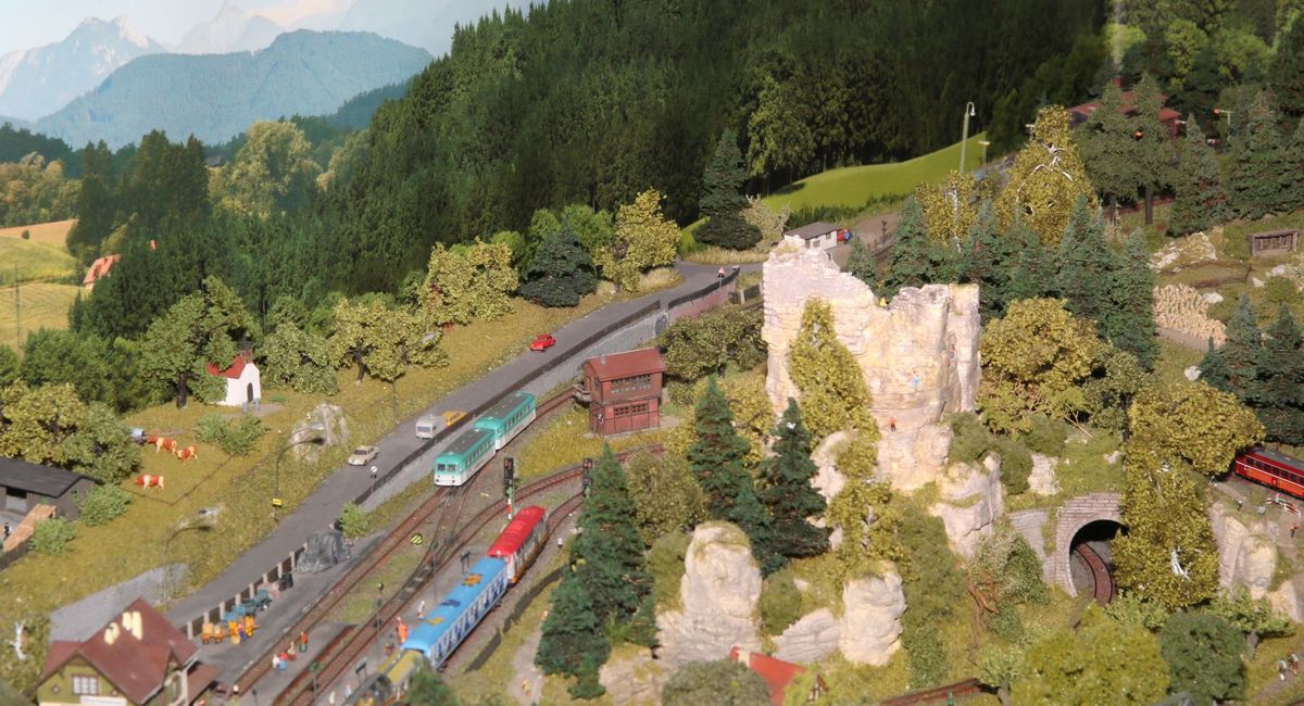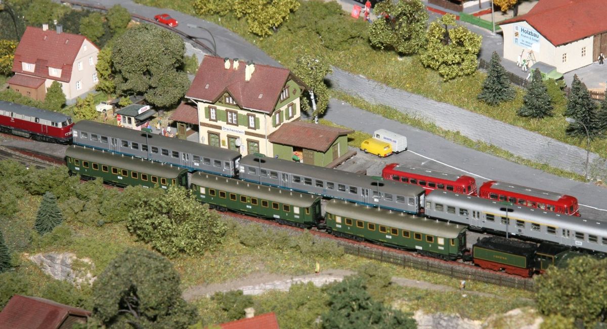 Noch raumfüllender als bisher und entsprechend dominant trumpfte die Spur-1-Modul-Anlage des Eisenbahnclubs Rosenheim auf. Der auf fünf Gleise erweiterte Bahnhof und die neuen Kurven mit den großen Radien nebst Bogenweichen waren dafür verantwortlich. Hier ist die Arbeit von Gerhard Glass hervorzuheben, der die neuen Module plante und anfertigte. Schorsch Höfer half beim Modulbau mit. Die vielen Lokomotiven – alle in Privatbesitz – glänzten mit einer Vielzahl an Funktionen, welche die Digital-Decoder hergaben. Verantwortlich für die Steuerung der Anlage und die Fahrzeuge sind Toni Lorenz und Rainer Wunderlich.