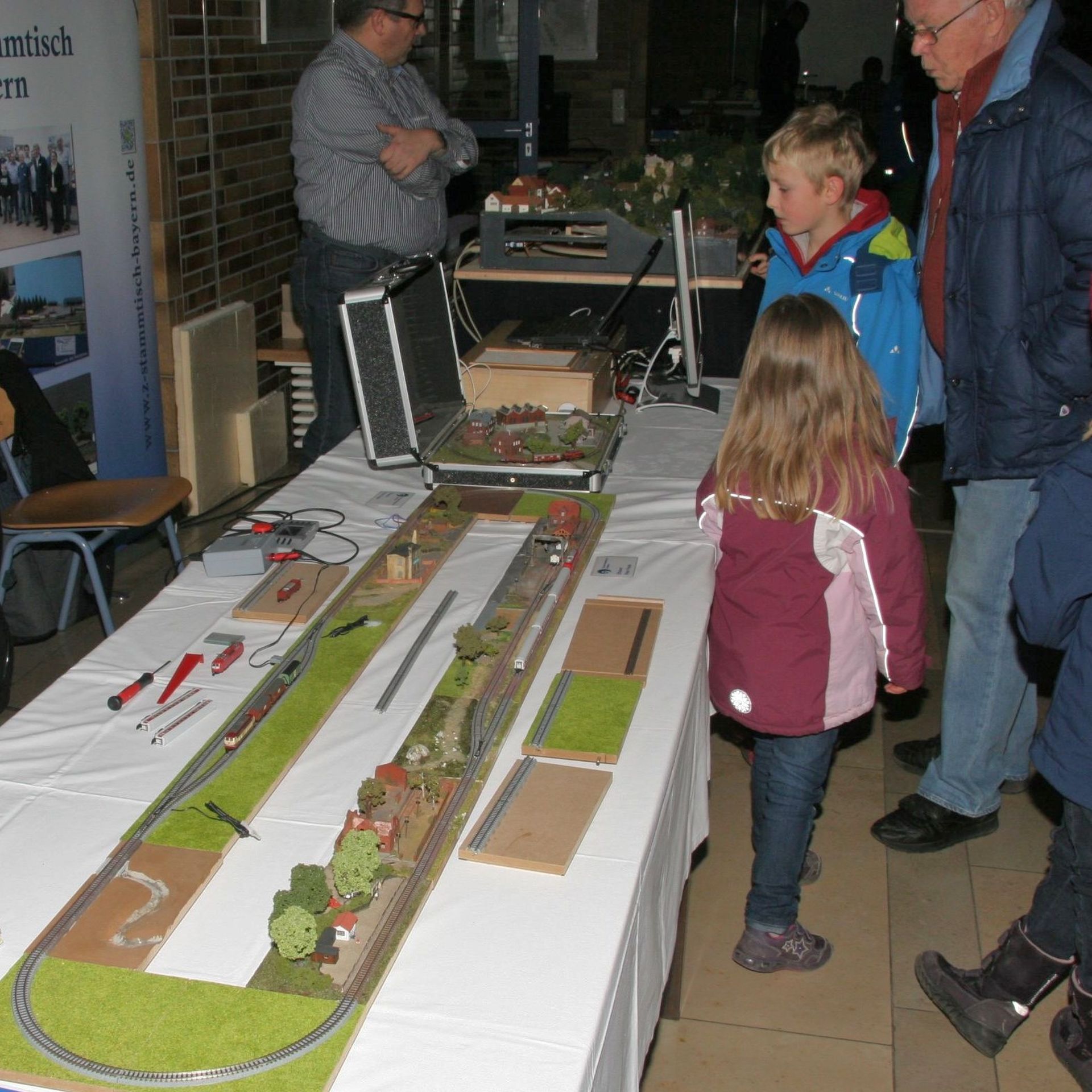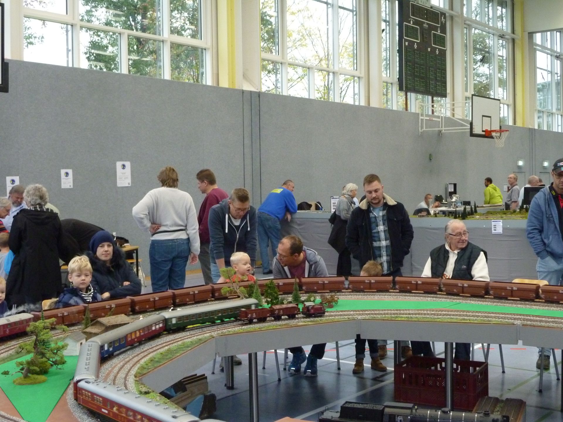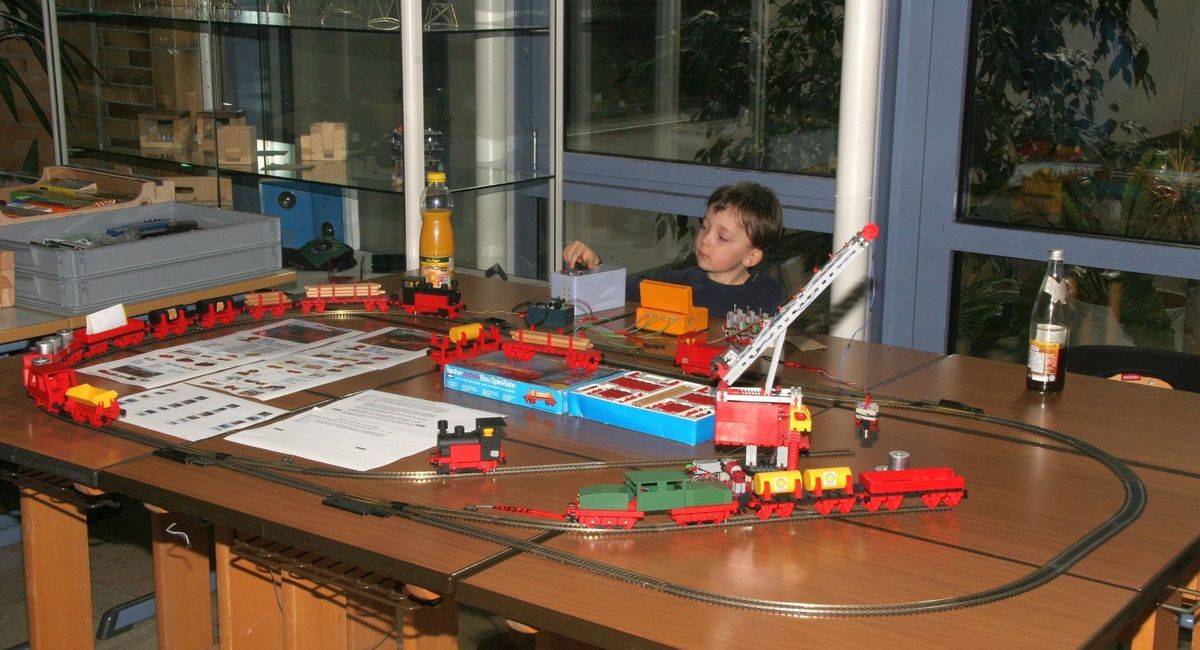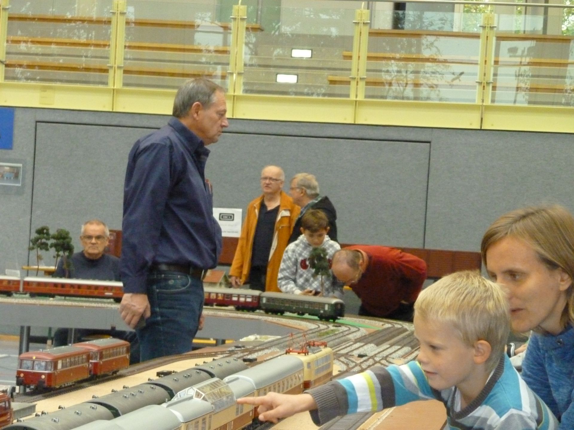 Besonders beliebt war die Kinderanlage. Da herrschte einiges Gedränge, weil jeder einmal einen Zug fahren lassen wollte. Manche Kinder kamen sogar an mehreren Tagen. Auch etliche Mädchen waren interessiert und hatten Freude an der Modelleisenbahn. Die Züge fuhren nicht nur im Kreis herum, sondern es wurde auch rangiert um Züge und Loks auszuwechseln. Besonders beliebt waren die Pfiffe und das Läuten der Lokomotiven. Da die Spielanlage auch in kleineren Räumen aufgebaut werden kann, ist beabsichtigt, öfter Kindern die Gelegenheit zum Eisenbahn-Spielen zu geben.