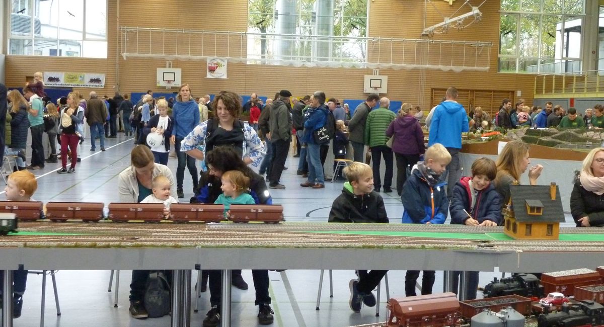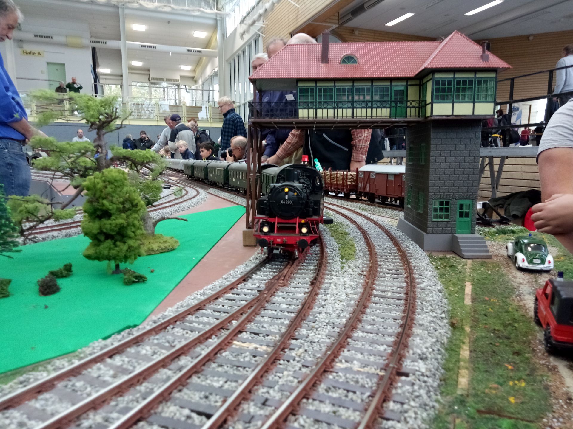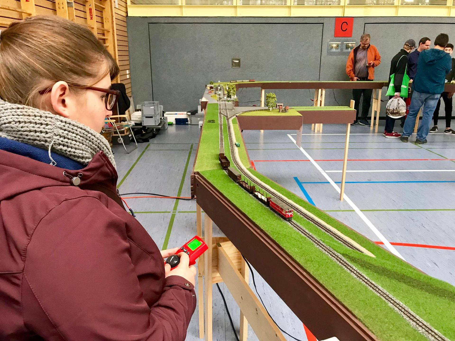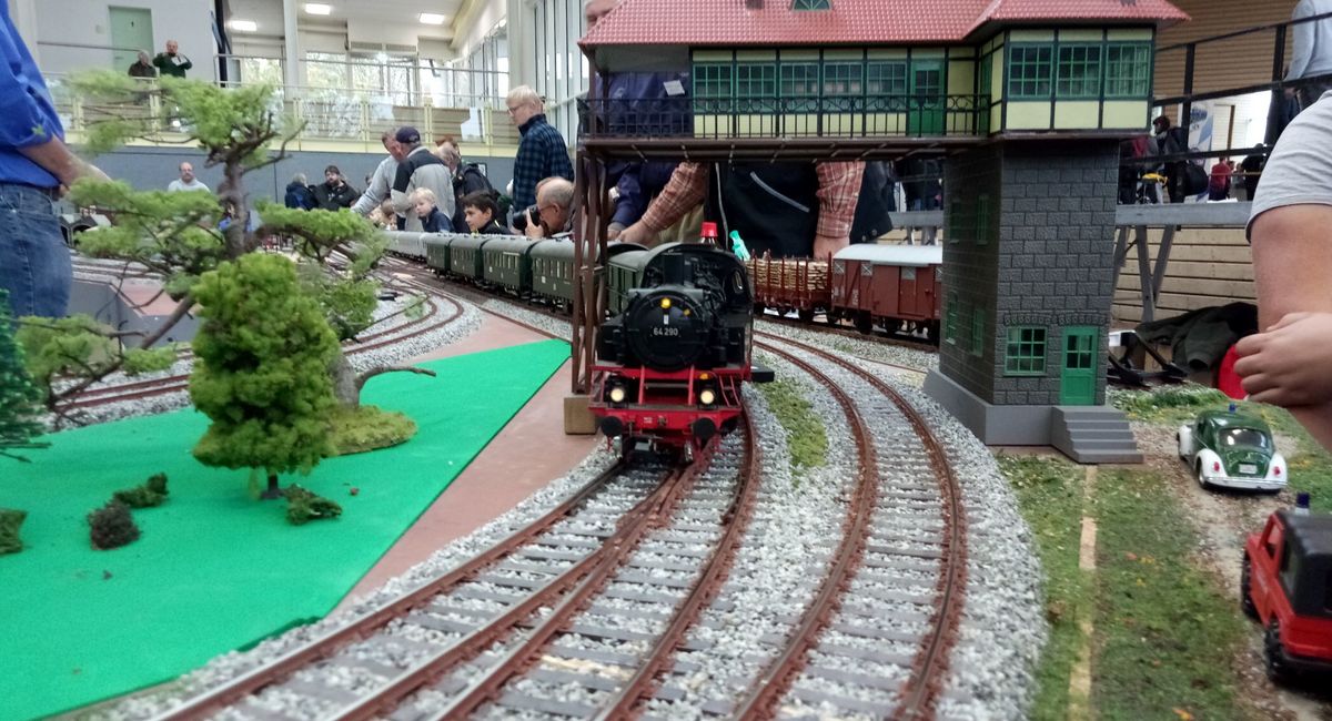 Besonders beliebt war die Kinderanlage. Da herrschte einiges Gedränge, weil jeder einmal einen Zug fahren lassen wollte. Manche Kinder kamen sogar an mehreren Tagen. Auch etliche Mädchen waren interessiert und hatten Freude an der Modelleisenbahn. Die Züge fuhren nicht nur im Kreis herum, sondern es wurde auch rangiert um Züge und Loks auszuwechseln. Besonders beliebt waren die Pfiffe und das Läuten der Lokomotiven. Da die Spielanlage auch in kleineren Räumen aufgebaut werden kann, ist beabsichtigt, öfter Kindern die Gelegenheit zum Eisenbahn-Spielen zu geben.
