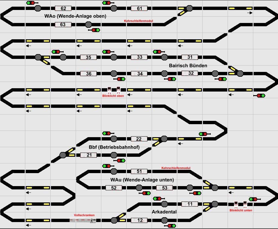 Teilbereich oben: Eine Wendeschleife über dem Eingang zur Clubanlage nimmt ebenfalls drei Züge auf. Es ist die WAo (Wende-Anlage oben, >60er Bahnhof<). Wenn nun von unten her (>20er Bahnhof<) ein Zug in Bairisch Bünden (>30er Bahnhof<) im Gleis 31 ankommt, dann stellt er den MARCo-Empfänger 34 auf Fahrt. Bairisch Bünden ist in drei Blöcken je Bahnhofsgleis unterteilt: Richtung oben 31 – 33 – 35. Richtung unten 36 – 34 – 32. Diese Blöcke in Bairsch Bünden sind vom Betrachter nicht alle zu erkennen, geben uns aber die Möglichkeit, zwei Züge mehr auf der Museumsbahn zu fahren und nebenbei den Betrieb so zu steuern, dass er flüssiger wird. Wie oben erwähnt fahren wir ja nicht schnell und die Strecken sind lang. In Bairisch Bünden ist also mehrfach anzuhalten. Nun kurz die Reihenfolge beschrieben nachdem der 34er Block frei wurde: 34 nach 32, 33 nach 35, 31 nach 33, Ausfahrt aus 32 Richtung 20er Bahnhof (Mittelteil). Mit der Ausfahrt aus 32 erfolgt auch die erste Freigabe im 60er Bahnhof. 63 fährt nach 36 und dabei nach dem Block 63 durch das zweite Kehrschleifenmodul unserer Museumsbahn. Im Block 36 angekommen, stellt die Programmierung den Empfänger 63 auf rot und den 62er auf grün. Nun geht es ans Nachrücken. 62 nach 63 und in der Folge 61 nach 62. Und wenn 62 wieder belegt ist, dann geht die Fahrt vom Block 35 weiter in die WAo zum MARCo-Empfänger 61. Ein Zug, der dann den 61er Baustein erreicht, hält dort an und gibt den Zug in Arkadental im Block 36 frei zum Vorrücken in den Block 34. Dann ist wieder die Grundstellung erreicht: In Bairisch Bünden warten – nicht sichtbar für das Publikum – zwei Züge im mittleren Teil jedes Gleises (Blöcke 33 und 34).